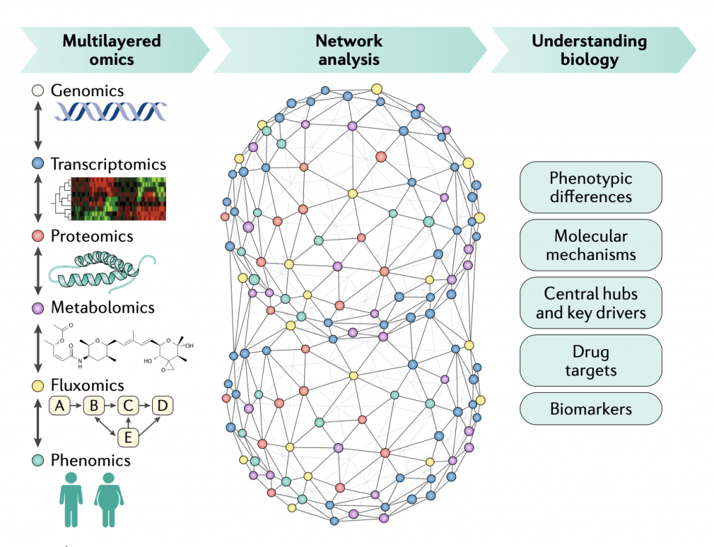Technological advances in the generation of omics data have enabled the characterization of cells or tissues in health and disease states. However, no single omics data type is able to reveal the complex behaviour of cells or tissues in different states. In this context, biological networks can be used for integration of multiomics data. This approach might reveal phenotypic differences and underlying molecular mechanisms involved in the occurrence of the disease to ultimately identify novel biomarkers and drug targets. These integrative systems biology approaches can be used in the development of efficient treatment strategies and to achieve the goals of personalized and translational medicine.