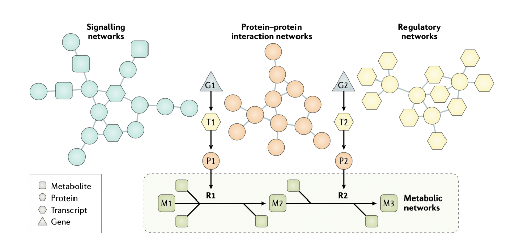 Individual biological networks, including metabolic, regulatory , signalling and protein–protein interaction networks, have been used in the analysis of omics data and to reveal the underlying molecular mechanisms of diseases to discover novel biomarkers and drug targets. High- quality omics data, including transcriptomics, proteomics, metabolomics and fluxomics, enable the generation of high- quality metabolic, signalling and protein–protein interaction networks. As shown in the figure, the effects of transcription factors and proteins on other proteins can be predicted by integration of different biological networks, and the level metabolites can be measured as a metabolic fingerprint in different clinical conditions. For example, gene 1 (G1) is transcribed to transcript 1 (T1), which is translated to protein 1 (P1); P1 then acts on metabolite 1 (M1) in reaction 1 (R1) to generate metabolite 2 (M2).