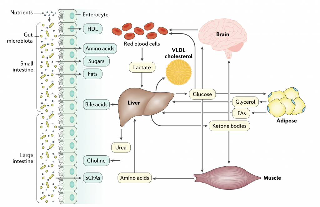 Understanding the interactions between different tissues and their interactions with the gut microbiota is necessary to gain detailed information about whole- body physiology. To study whole- body biological functions in health and disease states, simulation- ready cell specific or tissue- specific models, including those for the liver, adipose and muscle tissues, intestines, brain and red blood cells, as well as for the gut microbiota, can be integrated. Such knowledge can be used in elucidating the progression of metabolic diseases and for designing new therapies and clinical interventions. To study the crosstalk between liver and other human tissues, the secretion rate of VLDL cholesterol from liver can be measured, and these experimentally derived VLDL cholesterol kinetic data can be integrated with a liver genome- scale metabolic model (GSMM) and other constraints (glucose, ketone bodies, urea, bile acids and lactate) to simulate the dynamics of liver metabolism. The uptake and/or secretion rates of glycerol, fatty acids (FAs) and amino acids from adipose and muscle tissues can also be calculated on the basis of the body composition of each subject and integrated with the liver GSMM. The contribution of the gut microbiota to the host metabolism can also be predicted on the basis of diet, which accounts for the interactions among the microbiota. SCFAs, short- chain FAs.