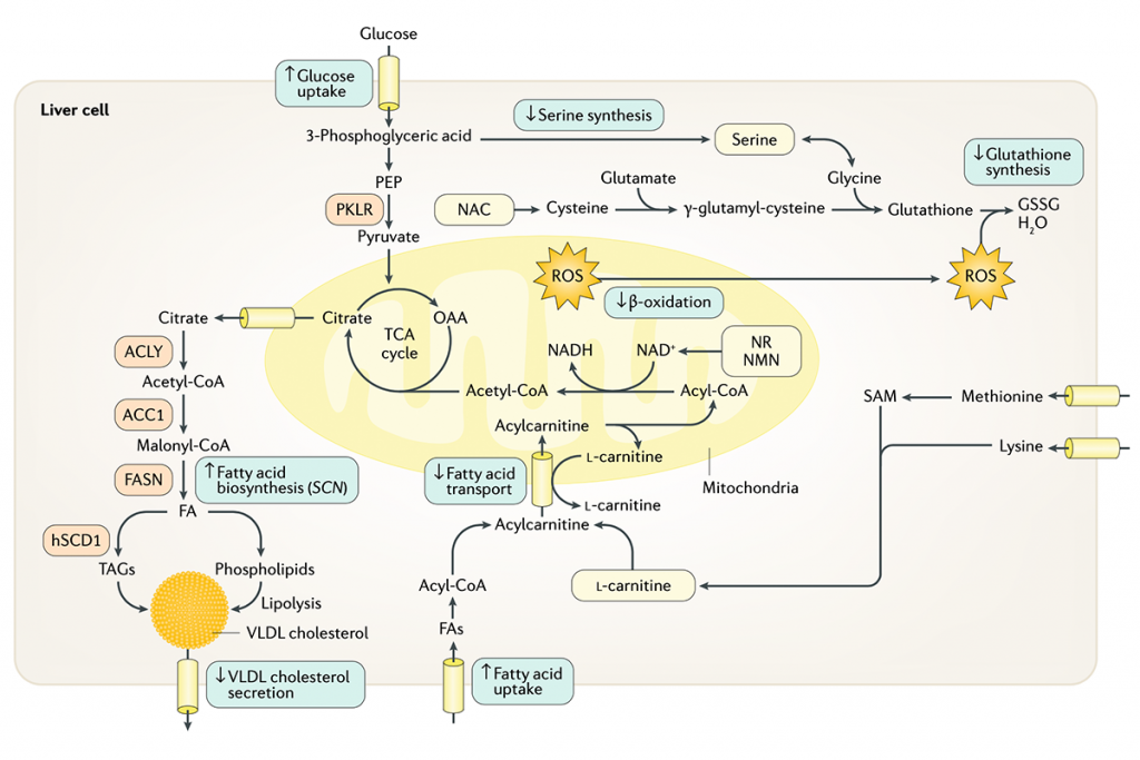 Liver Fat is caused by one or a combination of the following: improved delivery of fatty acids (FAs) to the liver ; increased endogenous FA synthesis; decreased mitochondrial FA oxidation; and deficient incorporation or export of triglycerides as VLDL cholesterol. New innovative approaches can be developed for effective treatment of liver fat by targeting one or more of these pathways. Proteins involved in de novo lipogenesis, including pyruvate kinase (PKLR), ATP- citrate synthase (ACLY), acetyl- CoA carboxylase 1 (ACC1), FA synthase (FASN) and stearoyl- CoA desaturase (hSCD1), have been targeted for inhibition of endogenous FA synthesis. Considering that altered NAD+ and glutathione metabolism (with an increased demand for NAD+ and glutathione) is a prevailing feature in NAFLD, supplementation of natural substances that might increase the level of NAD+ and glutathione could provide potential treatment strategies. For instance, natural substances, including serine, glycine and N- acetylcysteine (NAC), could be supplemented to boost the level of glutathione; the precursors of NAD+, including nicotinamide riboside (NR) and nicotinamide mononucleotide (NMN), could be supplemented to boost the level of NAD+; and L -carnitine could be supplemented to boost the transfer of FAs to the mitochondria. Supplementation of such natural substances (shown in yellow boxes) might eventually promote mitochondrial FA oxidation in liver, which can decrease the level of the accumulated fat in the liver. GSSG, glutathione (oxidized); OAA , oxaloacetate; PEP, phosphoenolpyruvate; ROS, reactive oxygen species; TAG, triacylglycerol; TCA , tricarboxylic acid; SAM, S- adenosyl-L- methionine.